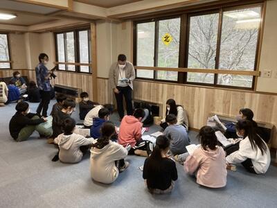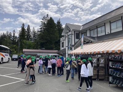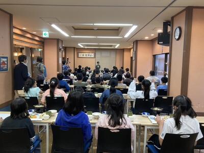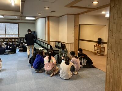 スパビレッジカマヤさんに着くと、宿の方が温かく迎えてくれました。到着の会では、「マナーを守って、たくさんの思い出を作りたいです」と、実行委員から話がありました。