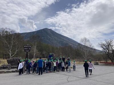 源泉の見学を終え、宿泊施設に到着しました。午後になり雲が低く広がり始め、男体山も半分くらい隠れてしまっています。午前中に学年写真を撮っていてよかったです。