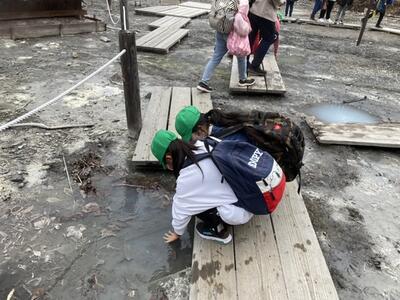 独特の硫黄の香りとともに源泉をさわって「あったか〜い」と驚く子ども達。