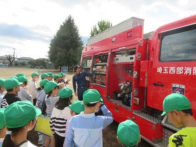 その後、3年生は社会科の授業の一環として、消防車の見学をさせていただきました。