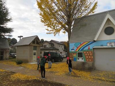 「わぁ、落ち葉のじゅうたんだ~!」と低学年の子が登校してすぐに気づき、さわり始めます。