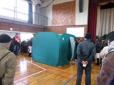 まず、訓練の説明があり、体育館や防災倉庫内にどんな荷物があるのかを全員で見学しました。