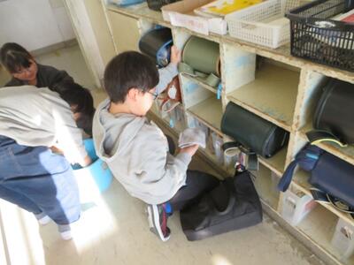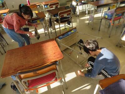 学期末、自分たちが生活している教室や廊下、くつ箱などの大掃除をしている4年生。雑巾を固く絞り、机やいすの足、ロッカーの中、早く終わった児童はくつ箱や床や壁の小さな汚れをふき取っています。友達と声を掛け合って、力を合わせて、道具を譲り合いながらおこなっています。