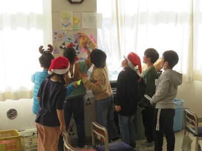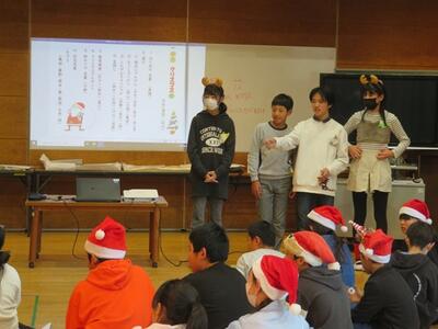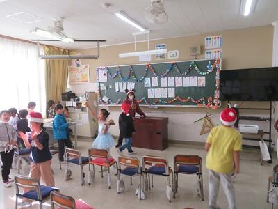 隣のクラスはクリスマス会を計画・実行し、「宝さがし」を行っていました。司会役の児童が「あと10秒です!」とみんなに見通しを持たせる発言をして、周囲の子はまだ見つかっていない宝物を探します。見つけたときは声を上げて喜びあっていました。