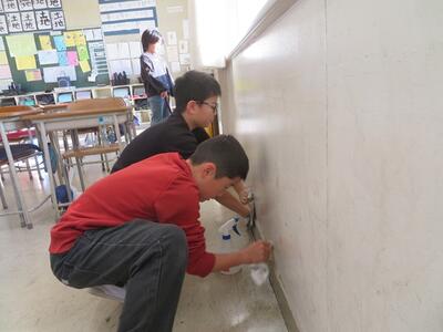 写真の真剣なまなざしを見てください。教室のかべについた小さな汚れを見つけ、心をこめてふき取っているのです。