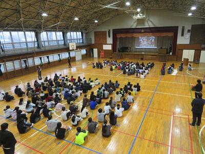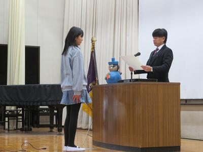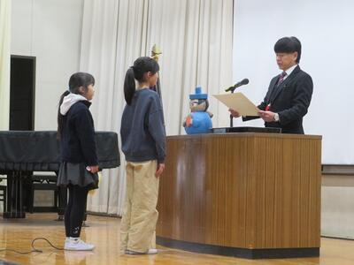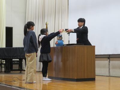 最後に、賞状伝達を行いました。友達のがんばりをたたえ、体育館には大きな拍手が響きました。