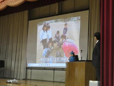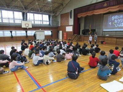 校長先生からは、日々の学校生活や行事の中で見られた、たくさんの子どもたちの「きらり」についてのお話がありました。話の聞き方もきらり、当たり前に思える行動も、様々な環境のある子供たちにとってはきらり輝く一瞬なのです。スクリーンに映し出された子どもたちの表情から、温かさや成長を感じる時間となりました。低学年も高学年もきらり!
