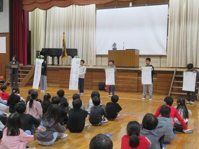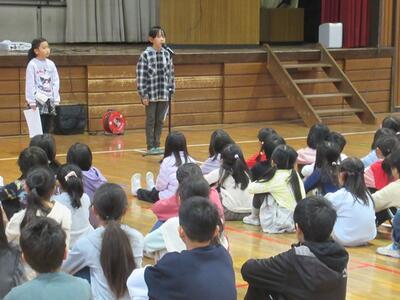 はじめに、2年生と4年生の代表児童が、2学期にがんばったことや、自分の中で「きらり」と輝いたことを発表しました。「小さな一言の大切さ」「あきらめず、勇気を出して取り組むこと」について一人一人の思いが伝わり、会場が温かい空気に包まれました。