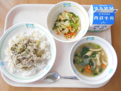 はつがげんまいごはん 牛乳 しおぶたどん キャベツのおひたし こまつなのみそしる