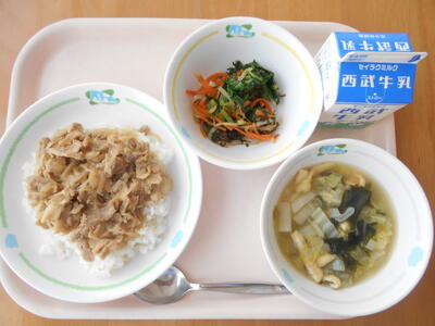 むぎごはん 牛乳 ぶたどん こまつなのいそあえ はくさいのみそしる