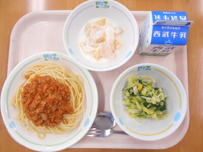 スパゲッティミートソース 牛乳 イタリアンサラダ フルーツのヨーグルトあえ