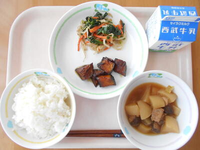 ごはん 牛乳 にくじゃが ごぼうのみつがらめ こまつなのおかかあえ
