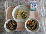 キムタクごはん 牛乳 イカのかりんあげ まめもやしのナムル こまつなスープ