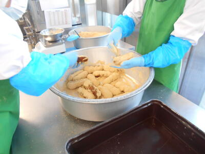 今日は子供たちに大人気のきなこ揚げパンでした。パンを油で揚げたら、すぐにきなこをまぶしていきます。そうすることで、揚げパンにたっぷりきなこが付き、とっても美味しいきなこ揚げパンになります。