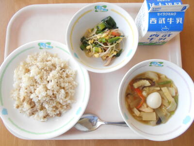 はつがげんまいごはん 牛乳 ちくぜんに じゃことだいずのいりに なっとうあえ