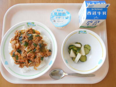 ごはん 牛乳 ぶたキムチどん かぶときゅうりのオイルづけ にゅうさんきんデザート