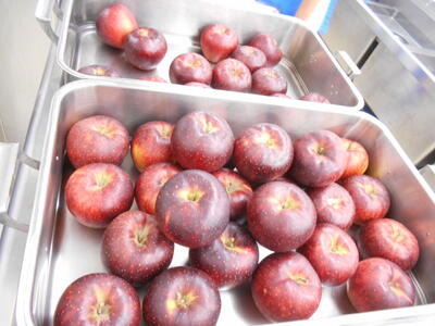 今日給食に使われたりんごは「秋映」と呼ばれるりんごで、写真のように完熟すると濃い赤色から黒みがかった赤色になるのが特徴です。シャキシャキとした歯ごたえ、香り、甘さを兼ね備えた、とっても美味しいりんごでした。