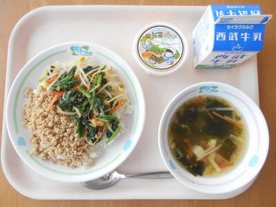 はつがげんまいごはん 牛乳 ビビンバ わかめスープ ほうじちゃプリン
