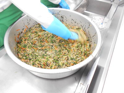 今日の納豆和えは、中富小で特に人気のメニューです。納豆の他に小松菜やにんじん、もやしなどの野菜が入っています。